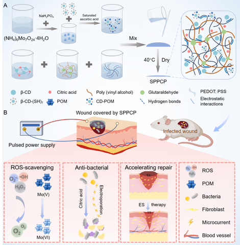 慢性创面因细菌感染和氧化应激常出现愈合缓慢、炎症反复等问题,已成为临床创面管理中的重大挑战。近日,我校杨震教授团队提出了一种多功能柔性导电凝胶敷料(SPPCP),该敷料由聚乙烯醇、导电高分子PEDOT: PSS、β-环糊精–柠檬酸超分子网络以及多金属氧酸盐(CD-POM)协同构建,具备优异的机械柔韧性、稳定的导电性和出色的组织黏附性。CD-POM赋予敷料高效的活性氧清除能力,可有效缓解氧化应激,诱导巨噬细胞向抗炎M2表型极化,并降低促炎因子水平,为组织修复创造有利的微环境。SPPCP在电刺激协同作用下,对大肠杆菌和金黄色葡萄球菌的抗菌效率超过99%,并可促进成纤维细胞的迁移与增殖。在动物感染性创面模型中,SPPCP联合电刺激疗法不仅能够减轻炎症、促进组织再生,加快血管生成,并促进胶原沉积与肉芽组织形成,从而加速创面修复进程。本研究提出了“电刺激+氧化还原调控”的新型设计策略,可动态优化创面微环境,为新一代柔性电子伤口敷料的开发提供了重要思路。研究成果以“Synergistic Supramolecular Conductive Dressing Integrating Electrical Stimulation and Polyoxometalate Antioxidants for Enhanced Chronic Wound Healing”为题,发表于中科院医学一区TOP期刊《Acta Biomaterialia》。