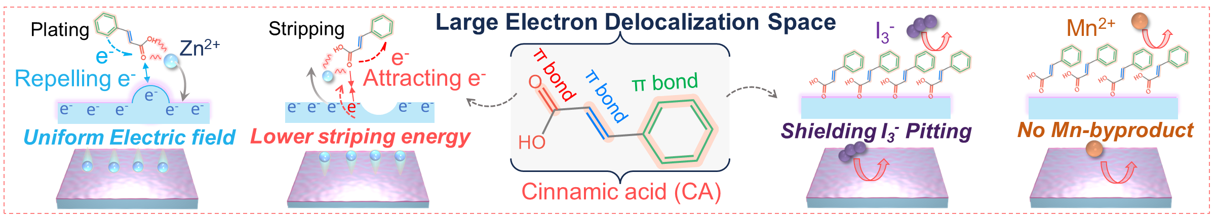 近期,针对Ah级别AZIB实际应用需求为导向,我校环境与资源学院陈庆华&钱庆荣&曾令兴教授与南开大学陈军院士团队联合研究,提出了一种动态调节电子和Zn2+离子的策略以实现锌均匀氧化还原,设计了系列具有不同电子离域空间的添加剂分子来验证这种动态调节机制,并总结了普适性的规律。较大的分子内电子离域空间、离域π键和‒COOH官能团的结合,促使肉桂酸(CA)分子在锌负极表面形成了一个稳定的分子层。该层可以有效地防止副反应,并通过驱动电子在共轭原子和官能团之间流动以动态调节负极表面的电子和Zn2+离子的排列,最终在锌氧化还原过程中动态的均匀化电场和Zn2+离子反应位点的分布。得益于这种动态调节,Ah级别的Zn//I2软包电池在2 mA cm-2下表现出1.473 Ah(188.7 Wh kg-1)的高容量和出色的倍率性能。这种动态调节在Ah级别的锌锰软包电池和锌溴电池中具有良好的兼容性。这项工作加深了同行对高可逆性Ah级别AZIB调控机制的理解。该工作成果以“Dynamic Regulation for the Well-distribution of Electrons and Zn2+ Ions Achieving Uniform Zn Redox in Ah-Scale Pouch Cells”为题发表于碳中和领域顶级期刊《Advanced Materials》,该论文第一单位为福建师范大学,第一作者为我校2022级博士生林楚园,通讯作者为曾令兴教授、严振华研究员和陈军院士,陈庆华教授和钱庆荣研究员为本研究工作的主要参与者。