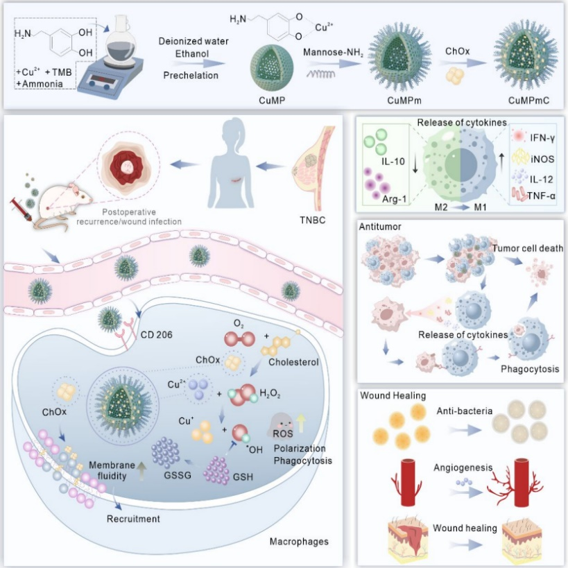 术后复发和感染仍然是乳腺癌有效康复的主要障碍,通常由胆固醇介导的巨噬细胞功能障碍驱动。为了解决这些问题,近期福建师范大学生命科学学院曾雪梅团队开发基于免疫治疗与纳米技术的创新融合,通过铜-多巴胺螯合和自聚合构建CuMPmC的多功能纳米平台。该纳米平台用甘露糖功能化,选择性靶向M2样巨噬细胞,并装载胆固醇氧化酶(ChOx)。CuMPmC通过ChOx介导的氧化消耗巨噬细胞膜胆固醇,增强质膜流动性,从而促进巨噬细胞趋化。同时,ChOx产生的H2O2驱动铜介导的芬顿样反应产生适度的活性氧(ROS),同时消耗肿瘤微环境中的谷胱甘肽。这种双重作用使巨噬细胞向促炎性M1表型分化,增强对肿瘤细胞和病原体的清除。实验表明,CuMPmC可显著降低术后肿瘤复发和感染。这些发现强调了胆固醇代谢在巨噬细胞功能重编程中的关键作用,并为乳腺癌术后治疗提供了有希望的免疫治疗策略。