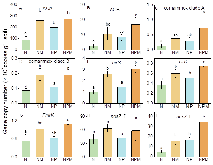 氧化亚氮(N2O)是一种强效温室气体,农业土壤是其最重要的排放源之一。近年来,有机肥部分替代化肥被视为一种可持续的施肥措施,但其对N2O排放的影响存在争议,尤其在亚热带普遍缺磷的酸性土壤中,其作用机制尚不清楚。我院团队依托中国科学院鹰潭红壤生态实验站21年的长期定位试验,利用15N同位素示踪和DNA稳定同位素探针技术,系统研究了粪肥替代在不同养分条件下对N2O排放的影响及微生物机制。研究发现:在单施氮肥的条件下,粪肥替代使N2O排放增加30%;而在氮磷配施条件下,粪肥替代使N2O排放显著降低22%。这种截然相反的结果源于氮转化过程的差异:单施氮肥时,粪肥替代刺激了自养硝化和反硝化作用;而在氮磷配施下,粪肥替代通过降低异养硝化对N2O的贡献,并伴随nosZ II型基因丰度增加,从而减少了N2O排放。
