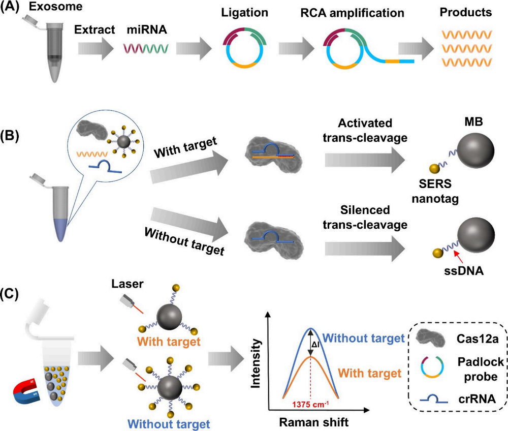 近日,我院王静研究员团队在表面增强拉曼散射(SERS)技术领域取得重要突破,成功开发了一种高灵敏、高特异性且能实现单碱基分辨率的外泌体miRNA-21检测新方法。该方法基于滚环扩增(RCA)与CRISPR/Cas12a系统的协同作用,可在便携式拉曼光谱仪上实现超灵敏检测,最低检测限达0.62 aM,并能准确区分单碱基突变体,大幅提升了检测精度与特异性。