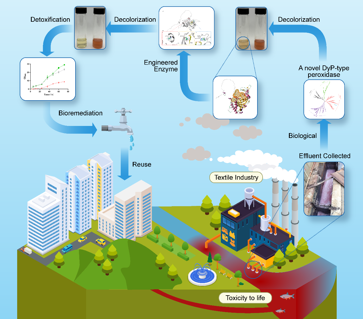 本研究首次从短杆菌(Brevibacillus agri) 中鉴定并功能验证一种新型染料脱色过氧化物酶 BaDyP,并系统评估其在真实印染废水中的降解与脱毒性能。通过异源表达,团队分别在大肠杆菌与酿酒酵母中获得活性酶,其中 E. coli 表达体系表现出更高的催化活性与溶剂耐受性。BaDyP 对活性黑5、刚果红、亚甲蓝等多种结构染料的去除率分别高达 96.7%、95.0% 和 93.2%,在宽 pH 与温度范围内保持稳定活性。在实际印染废水中,BaDyP 的脱色效率达 78.1%,经理性设计的 D240E 突变体进一步提升至 93.3%(增幅19.5%)。傅里叶变换红外光谱(FTIR)与毒性实验结果表明,该酶能有效断裂染料分子结构、降低废水毒性,揭示了其氧化降解机理。该成果填补了此类酶在真实染料废水处理中的实用案例空白,对印染行业绿色治理与水资源保护具有重要推动作用。