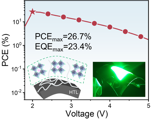 针对上述挑战,我校陈大钦教授团队开发出一种聚合物界面渗透工程策略:将聚(2-乙基-2-噁唑啉)掺入空穴传输层,并通过旋涂法使其在空穴传输层与发光层之间形成三维互穿网络结构,从而同步实现了缺陷钝化与杨氏模量匹配。基于该策略,所制备的绿光f‑PeLEDs取得了23.4%的外量子效率和26.7%的功率转换效率,均为目前文献报道的最高值之一;此外,推算其在100 cd/m2亮度下的半衰期长达1380小时。所得器件在连续弯曲4500次后,仍能保持80%的初始效率,并成功实现了4 cm2的大面积制备,显示出良好的规模化应用前景。