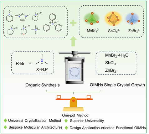 有机-无机杂化金属卤化物(OIMHs)因其独特的晶体结构和优异的光电性能,在固态照明、X射线闪烁体等领域展现出巨大潜力。相对于金属卤素阴离子,有机阳离子对其结构和性能的拓展起着关键性的作用。然而,以往已报道的大量结构高度依赖商品化有机阳离子,可选择的种类有限,这极大制约了新材料的创制。虽然预合成有机阳离子是一种替代方案,但会增加合成步骤、降低整体效率。因此,开发一种能够在晶体生长过程中原位生成目标有机阳离子的高效方法,是该领域亟待突破的关键科学问题。